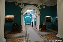 The two-storey palace of Field Marshal Pyotr Rumyantsev was built between 1777 and 1796[2] to a Neoclassical design attributed to Ivan Starov. The palace replaced the ruined castle of Gomel's previous owner, Michael Frederick Czartoryski.[3]