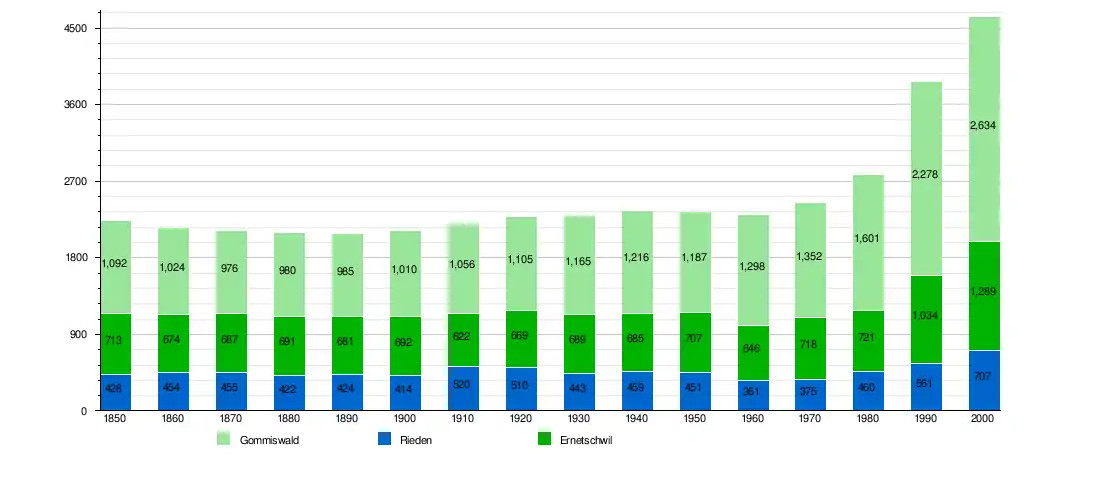 The construction of the Kaltbrunn-Ricken road in 1785-88 and the Uznach road in 1830 connected the village to the surrounding towns. In 1803 Gommiswald and Ernetschwil formed a short lived political municipality, but separated again in 1807. Gommiswald remained without industry until 1932 when the Wattefabrik Kistler opened. The factory employed 90 workers in 1979 and 40 in 2002. In 1956 Gommiswald, Ernetschwil and Rieden formed a secondary school district. Since 1960, the population has doubled and Gommiswald has developed into a residential and recreational community with new commercial buildings and many apartments, leading to an increase of commuting and urban sprawl.[4]