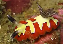 Goniobranchus fidelis can reach more than 25 mm (0.98 in) in length.[5] The foot of the animal is cream in color; it is elongate and is almost covered by the edges of the wide mantle. The more central part of the mantle has a creamy-white area with scalloped edges, whereas the entire wide margin of the mantle is orange or red. Where the two differently coloured areas meet, there is a burgundy-colored border which varies in width from one animal to the other. [6] The rhinophores are laminated, contractile and greyish in color with lighter colour at the tip. The shade of grey varies from one individual to another. The gills are the same colour as the rhinophores and they are retractable.[7][8]