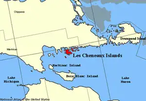 Goose Island, located in Lake Huron, is positioned 3.25 miles from Brulee Point on the mainland. The island is within Clark Township, Mackinac County, in the U.S. state of Michigan.[1] Goose Island is part of the Les Cheneaux Islands.[2]