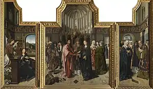 The known oeuvre of Goswin van der Weyden is limited. Whereas about 40 works have been attributed to the artist, many of the attributions are not unanimously accepted. Attributions of works are based on a few works for which there are documents to prove the authorship.[1] His best documented works are the Triptych of Antonius Tsgrooten (1507, Koninklijk Museum voor Schone Kunsten Antwerpen), The Life of Saint Dymphna (1505, The Phoebus Foundation), both painted for the Abbey of Tongerlo, and The Gift of Kalmthout (1513, Gemäldegalerie, Berlin) painted for the same abbey in 1513.[2]