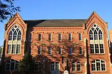 Woods Hall was the first new building on campus following the Civil War. Constructed from 1867 to 1868 out of salvaged bricks from campus buildings destroyed in the war,[10] the four-story brick structure was built with a Gothic Revival arcade on the ground floor, end facades in the Gothic Revival style with a crenelated roof, and cast iron galleries on the central upper floors. Initially known simply as "the barracks," it was used as a dormitory. It also had a dining hall and classrooms on the ground floor. It remained a dormitory until 1961, when it was converted for use by the Department of Art and Art History.[8][9]