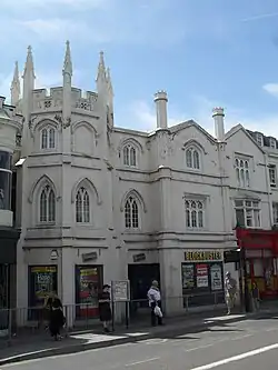 The building's placement opposite the Western Pavilion "nicely illustrates the stylistic variation of the Regency period"[11] and provided a clear contrast to its elaborate Oriental style, especially before it was converted for commercial use.[6] Above the "mutilated"[12] ground floor, the upper parts of the building are mostly unchanged from the original design:[8] the hood-moulded windows have pointed arches and tracery, and the polygonal corner tower has a crocketted pinnacle at each corner.[1][13][21] Buttresses rise from ground-floor level on this section. The shopfront added in 1920 by Henry Ward has two storeys and rounds the corner into Western Terrace, partly hiding the original structure.[13]
