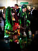 The Cybergoth and rivethead subcultures emerged in America during the late 1990s, and combined classic gothic fashions such as leather duster coats, tripp pants or Demonia brand platform boots with the clothing worn by fans of industrial metal and rave music to create a dystopian, futuristic science fiction look.[26][27] Shaved heads, synthetic neon dreadlocks, camouflage, tight leather pants, chains, platform boots,[28] stretched body piercings, sleeve tattoos, goggles, corsets, PVC or leather skirts, and black trenchcoats decorated with metal studs are frequently seen on members of this subculture.[29]
