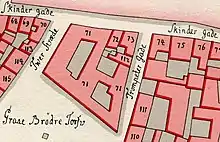 The entire north side of the square was part of one large property in the late 17th century. In 1689, it was listed as No. 83 in Frimand's Quarter and owned by Ceremonimiester Frederik Gersdorff (16501691).[1] Together with most of the other buildings in the area, the property was destroyed in the Copenhagen Fire of 1728. Counter Admiral Peter Hiort constructed a large new townhouse on the site in the early 1730s. It was later acquired by Wilhelm, Count Gyldencrone. The property was listed as No. 71 from 1756. The building comprised a 20-bay-long main wing on Ulfeldts Plads (now Gråbrødretorv) and a two-storey secondary wing on Trompetergangen (now Niels Hemmingsens Gade).