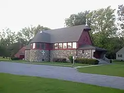 Grace Church is a historic Episcopal church located at Scottsville in Monroe County, New York. The church was designed by noted Rochester architect Harvey Ellis (1852-1904) and built in 1885. It is in the Latin cross form in the Richardsonian Romanesque style. It has a native fieldstone lower level with an upper section of frame construction with a non-structural wall of stained glass. It features rounded apsidal and transept ends topped by conical roofs. Attached is a Sunday school wing constructed in 1956 and a square, shingled bell tower added in 1976.[2] It is a congregation in the Episcopal Diocese of Rochester.