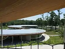 Opened in 2015, the River building was designed by the Japanese architectural firm SANAA, led by Kazuyo Sejima and Ryue Nishizawa.[10][11] The porous design of Grace Farms and the River building was meant to inspire and break down barriers between people and nature. Natural light flows through more than 200 floor-to-ceiling glass panels in the River building, generating 360-degree views of the landscape in the changing seasons. The undulating pathways under a curvilinear roof follow the flow and elevation of the land. The River building has been honored nationally and internationally with numerous prestigious design awards.