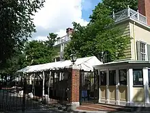 The merchant Archibald Gracie, at the time one of New York City's richest men,[24] bought Walton's land in two phases in December 1798 and January 1799.[25][21] At the time, the Gracies' city residence was a house that they rented from New York City mayor Richard Varick.[26][27] Gracie built a new country estate on the Walton site in 1799,[28][29][30] though there is disagreement over whether Gracie reused the remains of Belview Mansion or destroyed the older house altogether.[15][31][lower-alpha 1] In either case, Gracie removed the Revolutionary War-era earthworks and landscaped the gardens.[33] Gracie's mansion was abutted to the west by the house of banker Nathaniel Prime,[34][35] which later became St. Joseph's Orphan Asylum.[35] There were various other houses along the East River,[36] including those of the Rhinelander family,[34] Alexander Hamilton, John Jacob Astor, and Isaac Chauncey, which have long since been demolished.[37] Gracie Mansion, at the time, was accessible only via the East River and was several miles from the developed parts of Lower Manhattan.[30][33] A large tree stood on the grounds, along the bank of the East River.[18][38] There was a dock and a stone stable just south of the house.[38]