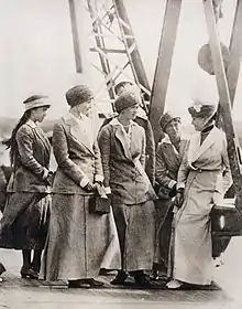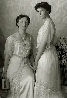 Before World War I, there was some discussion of a marriage between Olga and Prince Carol of Romania. In 1914, Foreign Minister Sergey Sazonov advocated the match because he wanted to ensure that the Romanian royal family would support Russia in case of a future conflict.[62] Nicholas and Alexandra saw the benefits of the match, but they insisted that "the grand duchess's marriage ... should take place only as the result of a much closer acquaintance between the young people and on the absolute condition of their daughter's voluntary agreement to it."[63] In March 1914, Crown Prince Ferdinand of Romania, Crown Princess Marie of Romania, and Prince Carol of Romania visited the Romanovs in St. Petersburg. Despite going on walks and dinners with each other, Olga and Carol seemed uninterested in each other. During a visit to Romania in the spring of 1914, Olga and Carol were uninterested in each other and did not speak to each other.[64] Crown Princess Marie of Romania noted that Carol was "not enamored of Olga's broad, plain face and brusque manner."[65] She judged that Olga's face "was too broad, her cheekbones too high,"[66] and she told her mother that all of the grand duchesses "were not found very pretty."[67] Marthe Bibesco, who was with the Romanian party, heard a rumor that the grand duchesses had "decided... to make themselves as ugly as they could.... so that Carol should not fall in love with any of them."[68]