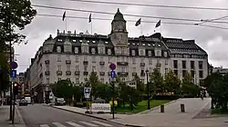 Grand Hotel is situated in a very central location on the main thoroughfare, the Karl Johans gate, between the Norwegian Parliament building and the Royal Palace. It is within walking distance of Oslo's main shopping and cultural areas, as well as its sights. The hotel was opened in 1874 and is one of the most traditional hotels in Norway.[1]