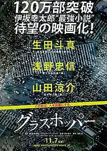 Grasshopper (グラスホッパー) is a 2015 Japanese revenge thriller film directed by Tomoyuki Takimoto and starring Toma Ikuta, Tadanobu Asano and Hey! Say! JUMP member Ryosuke Yamada.[2] It was released in Japan on November 7, 2015.[3][4] It is based on the 2004 novel of the same name by Kōtarō Isaka, the first novel in his Hitman trilogy. An American adaptation of the second novel, Bullet Train, was released in 2022.