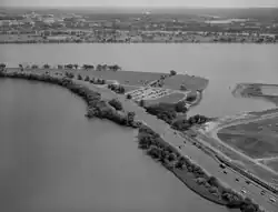 Aerial view of Gravelly Point circa 1968 with the George Washington Parkway in the foreground and the end of Reagan National Airport runway 19 at right.