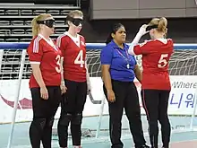 ![]() Great Britain women's goalball team defending, Copper Box arena, 2012 Paralympic Games, London, England (Sep 2012). | |