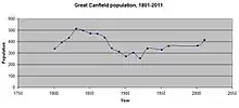 Recorded from past census statistics; the population of Great Canfield has seen only one major decline in population, from its peak population of 511 in 1831, to 271 by 1901.[6] Census data shows that a decline in population was consecutive with every recorded census between 1841 and 1901. An increase in population within Great Canfield after the census of 1841 was not recorded until 1911; the population rose from 271 recorded in 1901, to 305 by 1911- an increase of 34.[6] Since the 1921 Census Great Canfield has seen regular increases in population, the greatest between the years 1921-1931 where there was an increase of 86, from 254 to 340. Since then the increases have been moderate.