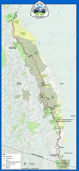 While the Great Divide Trail is a recognized hiking trail,[3] only portions of it are officially recognized by Parks Canada and therefore is often not signed and occasionally not even an actual trail - merely a wilderness route. At present, the Great Divide Trail is about 80% singletrack, 10% wilderness route and 10% old roads and ATV trails.
