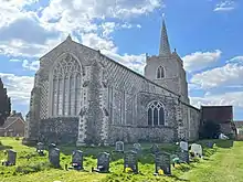 The site of Great Ellingham has been inhabited since pre-historic times and is documented in the Domesday book of 1086. Its name comes from the Old English for 'The homestead of Ella's or Eli's people'.[4] The medieval period provides the oldest surviving, mainly 14th century, building of St James the Great's Church, [5] in the Benefice of Great Ellingham.[6] This "attractive chequered flintwork and battlemented west tower [is] topped by a lead spire" was restored in the early 20th century.[7] The spire can be viewed from some distance away as the village is approached on the Attleborough road.