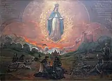Painting of the plague in Vilnius depicts Virgin of Mercy holding broken arrows of God's wrath. It hangs inside the Church of St. Peter and St. Paul, Vilnius.