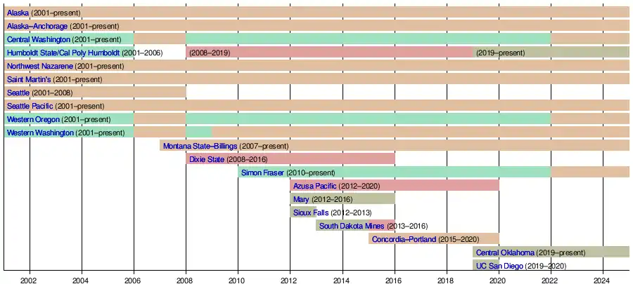 - ↑ Cal Poly Humboldt was a full member of the GNAC from 2001–02 to 2005–06. However it remains in the GNAC as an affiliate member for women's rowing.