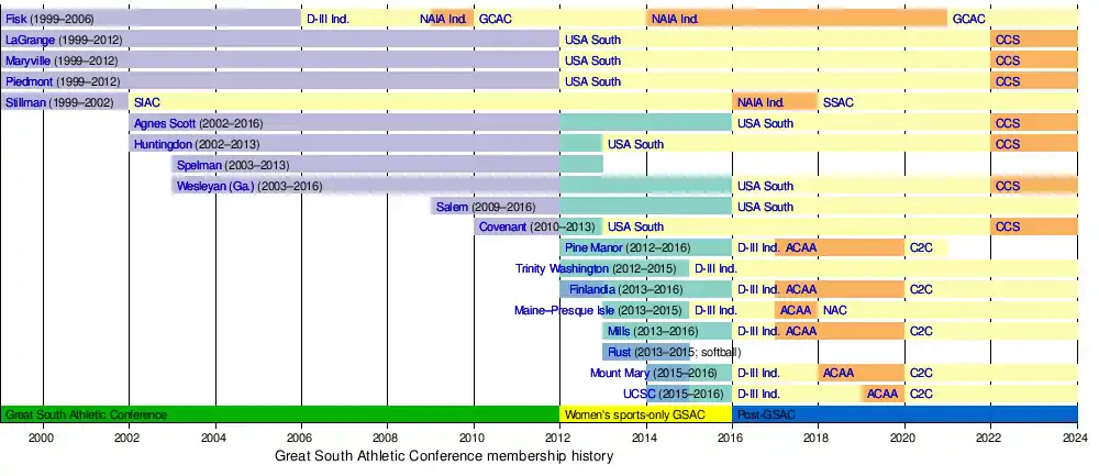 On May 6, 2015, the USA South Athletic Conference announced that Agnes Scott College, Salem College, and Wesleyan College would be leaving the GSAC and joining the USA South beginning in the 2016-2017 season.[9]