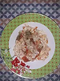 Macedonian cuisine (Greek: Μακεδονική κουζίνα) is the cuisine of the region of Macedonia in northern Greece. Contemporary Greek Macedonian cooking shares much with general Greek and wider Balkan and Mediterranean cuisine, including dishes from the Ottoman past. Specific influences include dishes of the Anatolian Greek, Aromanian and Megleno-Romanian, Slavic, Armenian and Sephardi Jewish population.[1] The mix of the different people inhabiting the region gave the name to the Macedonian salad.[2]