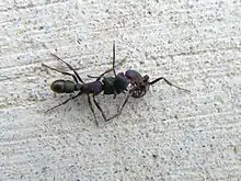 Green-head ant males are produced irregularly throughout the year and are low-flying ants.[48] Recorded nuptial flights begin between September and November at temperatures of 20–25 °C (68–77 °F), when a number of males begin to emerge from their nest.[49] Sometimes, however, the males may return to their nest after briefly appearing outside. The green-head ant is a gamergate species, which means that males can successfully mate with the workers.[50] These workers remain outside their nest with their head and thorax appressed and gaster elevated into the air. Observation has shown the workers first attacking the males when the two first encounter each other, followed by the male mounting the worker by grasping it in the cervical region with its mandibles, successfully attaching itself.[49] Both ants usually rest when they mate, but sometimes the workers may groom themselves or move about several moments after, thereby disengaging with the male. On a few occasions, workers have been seen to move as soon as copulation begins and drag the male, eventually dislodging it. Copulation usually occurs at 8 to 9 in the morning, with pairs lasting for 30 seconds to almost one minute. Most pairs mate once, but others may copulate with each other twice. In some cases, males will successfully mate with two workers, and some pairs may return to their nest while mating.[49]