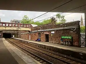 The line and platforms are about 26 feet (7.9 m) below street level,[8] in a cutting with red sandstone masonry retaining walls. The station building has a staircase down to Platform 2 (westbound), an enclosed footbridge leads across to the stair to Platform 1 (eastbound). The building is on the corner of Newton Street, which at the point it goes across the railway cutting changes direction to align with the grid plan of the west end of Greenock. From this point, the Newton Street tunnel runs directly under the street. About 920 feet (280 m) from the West Station, the tunnel goes under the older G&SWR tunnel taking that railway line down to Princes Pier. Beneath the upper end of Newton Street, where it merges into Lyle Road, the tunnel curves round towards Fort Matilda railway station.[9]