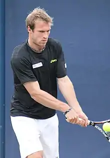 Grega Žemlja (born 29 September 1986) is a retired Slovenian tennis player. He has won five singles titles and one doubles title on the ATP Challenger Tour. In 2012, he reached the third round of the US Open, the first Slovenian male player ever to reach that stage in a Grand Slam tournament. He is also the first Slovenian ATP player who in 2013 reached third round at Wimbledon. He reached his highest ATP ranking of world No. 43 in singles in May 2013, becoming the first Slovene ATP player to reach the top 50. Žemlja also became the first Slovene player earning over 1 million US dollars in prize money, and he was the highest-paid Slovene player in history until he was passed by Blaž Kavčič. He represented his country as a member of Slovenia Davis Cup team.