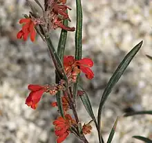 Grevillea bronweniae is an erect shrub that typically grows to a height of 1.0 to 1.8 metres (3.3 to 5.9 ft). The leaves are linear to narrowly elliptic with the narrower end towards the base, 10 to 160 millimetres (0.4 to 6.3 in) long and 2 to 14 millimetres (0.08 to 0.55 in) wide with the edges curved down or rolled under. The flowers are arranged in wheel-like clusters in leaf axils and at the ends of stems, on a rachis 0.5–2.0 mm (0.020–0.079 in) long, and are scarlet. The pistil is 8–12 mm (0.31–0.47 in) long and hairy. Flowering occurs from June to November and the fruit is a woolly-hairy, narrow oval follicle about 15 mm (0.59 in) long.[2][3][4]