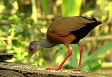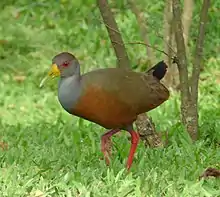 The grey-cowled wood rail usually measures 33–40 centimetres (13–16 in) long and weighs 320–465 grams (11.3–16.4 oz), particularly large for a wood rail.[7] The upperparts are olive-green to dark brown. The head and neck are medium-grey, blending into a brown patch at the back of the head. The eyes are red. The chest and flanks are rufous. The belly, rump, and tail are black. The legs are coral-red, while the bill is a bright greenish-yellow. The males and females are similar.[9]