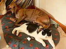 Some Greyhounds have a strong prey drive, having been bred to hunt and chase. For a few Greyhounds this urge can be difficult or impossible to overcome through training.[9] Frequently, Greyhound adoption agencies require owners to keep them on-leash at all times, except in fully enclosed areas. A few agencies will also advise owners to keep their Greyhounds muzzled around other dogs with which they are not familiar. While some owners disagree or ignore this advice, adoption groups like those linked here are generally very clear about this requirement. For the best interests of the breed in general they encourage owners to be cautious with Greyhounds because on the track they are trained to run and chase regardless of weather or injury or individual desire, while at the same time breeders select dogs with a strong prey drive for breeding.[10][11][12][13]