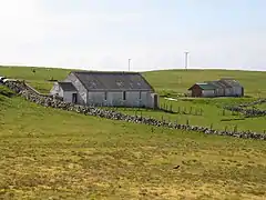 There is a late Neolithic site on the Ness of Grutling, where burnt barley has been found.[1] An area of about 3.3 hectares (8.2 acres) shows signs of neolithic agriculture and neolithic genocide, with about fifty piles of stones cleared from the fields.[2] The barley had a radiocarbon date of within 120 years of 1564 BC. Pottery found on the Ness of Gruting shows affinities with Neolithic wares from the Hebrides, indicating cultural contacts.[3] Split flakes of porphyry for skinning have been found.[4]