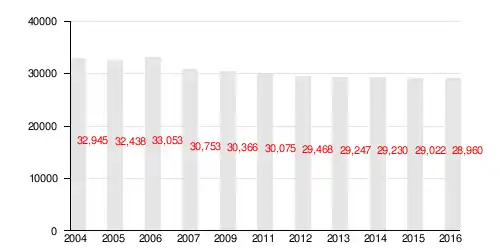 According to the Central Statistical Office data, the district's area is 5.85 square kilometres (2.26 square miles) and 28 960 people inhabit Grzegórzki.[1]