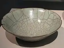 The crackle arises during cooling, when the coefficient of expansion differs between the glaze and the body.[15] There are several layers of glaze, and the glaze is often thicker than the clay body, as can be seen in sherds.[16] The crackle does not occur through all layers. Most shapes were wheel thrown, but moulds and slab-building were also used.[17] Less usual shapes include those derived from ancient ritual bronzes and jade congs.[18] Bowls and dishes often have "lobed or indented rims".[19]