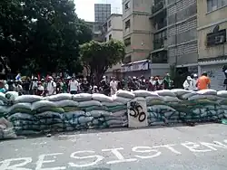 Traffic blockades were carried out in streets and avenues, mainly in middle and upper class residential neighborhoods nationwide, and became places where opposition demonstrations regrouped.[29] The "guarimbas" were a divisive tactic, generating accidental deaths and conflict among the opposition itself. Critics have argued that it has been a counterproductive method that has affected local residents and businesses with little political impact.[30] The government of Nicolás Maduro took advantage of them to disqualify the opposition as "fascist" and "violent".[29][31]