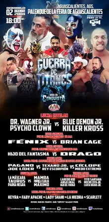 Starting in 1997 the Mexican professional wrestling, company AAA has held a major wrestling show late in the year, either November or December, called Guerra de Titanes ("War of the Titans"). The show often features championship matches or Lucha de Apuestas or bet matches where the competitors risked their wrestling mask or hair on the outcome of the match. In Lucha Libre the Lucha de Apuetas match is considered more prestigious than a championship match and a lot of the major shows feature one or more Apuesta matches. The Guerra de Titanes show is hosted by a new location each year, emanating from cities such as Madero, Chihuahua, Chihuahua, Mexico City, Guadalajara, Jalisco and more.[1] In 2016 AAA moved the Guerra de Titanes show to January,[2] with the 2017 version continuing that trend.