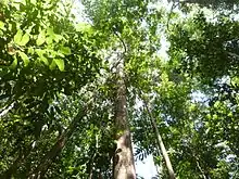 Tropical forest covers most of the territory of the Park where the number of vascular plants present is estimated at between 4,000 and 5,000 species (including more than 1,000 trees), or a tenth of the world's plant biodiversity.[13] The tallest trees such as the Hura crepitans and Ceiba pentandra can reach 55 to 65 meters in height.[14] A single hectare of forest frequently contains more different species of trees than the entire flora of Metropolitan France.[13]