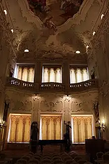 - ↑ The date of institution of the Concert hall and its associated concerts is so given in the SIUSA (Ministry of Culture) reference: "Il 22 novembre 1923 venne inaugurata un'apposita sala da concerto all'interno del palazzo insieme all'Istituzione concerti da camera che prese nome dal motto della famiglia Chigi Saracini (Micat in Vertice)." The Chigiana website, section "Storia: Il Conte Guido Chigi Saracini", however, says: "Nacque così l'idea di costruire il Salone dei Concerti con il grande organo, inaugurato il 22 novembre 1932, giorno di Santa Cecilia, dando vita alla stagione concertistica MICAT in VERTICE." (Read here). SIUSA (1923) seems to be correct (1932 was the date of formation of the Academy).