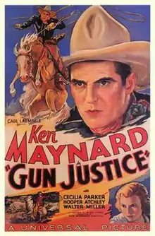 Gun Justice is a 1933 American Western film directed by Alan James and written by Robert Quigley. The film stars Ken Maynard, Cecilia Parker, Hooper Atchley, Walter Miller, William Gould and Jack Rockwell. The film was released on December 11, 1933, by Universal Pictures.[1][2][3]