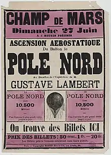 Lambert estimated that the cost would be 600,000 francs, and sought funding from all sources.[22] The Marquis Prosper de Chasseloup-Laubat, former Minister of the Marine and President of the Geographical Council, joined with de Quatrefages in presenting the project to the Emperor.[17] Napoleon III placed his name at the head of the list of subscribers, promising 50,000 francs.[8] The Corps législatif voted 150,000 francs. Lambert tried to engage the public imagination by floating a huge airship, the Pôle Nord, from the Champ de Mars. The vaudeville performers and caricaturists took to the project, but the general public remained indifferent.[23]