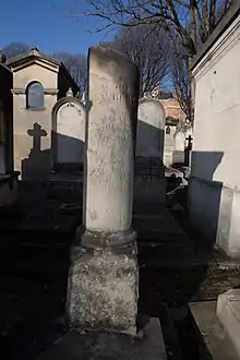 At the time of Lambert's death on 19 January 1871 it was already clear that France's capitulation was inevitable.[30] His funeral was held on 30 January 1871, when his body was taken to the Père Lachaise Cemetery. A bronze bust of the explorer was placed on his tomb. Some time before 1895 the body was exhumed and taken to a plot provided by the city of Paris, with the bust replaced by a broken column.[31] A monument was erected to Lambert in the Père Lachaise Cemetery in January 1924.[32]