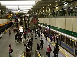 The station is a three-level, underground structure with two island platforms and nine exits. The two platforms are stacked, allowing for cross-platform interchange between the Songshan–Xindian line and the Zhonghe–Xinlu line. Public art at the station is titled "Chance of Meeting" and features 12 face masks representing contrasts such as day and night, noisy and quiet, time and space, etc.[4] It was selected by international competition and cost NT$4,999,000.