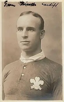 Erith Gwyn Nicholls (15 July 1874 – 24 March 1939)[2] was a Welsh rugby union player who gained 24 caps for Wales as a centre. Nicholls was known as the "Prince of Threequarters".[3]