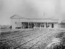 The passing of the North Coast Railway Act in 1910 which linked the separate regional divisions of Queensland Railways into one network, provided increased spending and construction works within Queensland railways. Construction commenced on the present station in 1913, which commenced operations on 1 December 1913.[2] The station was based on the Queensland Railways A ‘Pagoda’ standard design.[2] Positioned on an island platform the long narrow chamfer-board building housed: a bar; refreshment room and servery; waiting room; ladies room; station master's office; telegraph and booking office; and a sheltered sales area. The smaller upper floor housed: the kitchen; scullery; and pantry. This floor was serviced by a hand-operated lift.