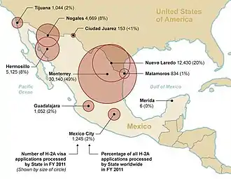 - ↑ "Number of I-129 Petition for a Nonimmigrant Temporary Agricultural Worker (H-2A) by Case Status and State, July 1 - September 30, 2013" (PDF). United States Citizenship and Immigration Services. March 19, 2014. Retrieved April 23, 2016.
