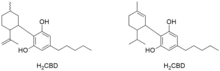 The term "H2CBD" can refer to two different chemical compounds that differ by the site of hydrogenation, either saturated on the cyclohexenyl ring (i.e. 1,2-dihydrocannabidiol using the older terpenoid numbering scheme) or saturated on the isopropenyl side group, which is known as 8,9-dihydrocannabidiol.