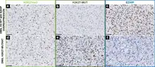 Diffuse midline glioma, H3K27me3-altered (DMG), also known as diffuse intrinsic pontine glioma (DIPG) is a type of highly aggressive brain tumor mostly found in children. All DMGs exhibit loss of H3K27me3, in about 80 % of cases due to a genetic mutation receplacing lysine with methionine (M), known as H3K27M. In rare forms, H3Kme3-loss is mediated by overexpression of the EZH inhibiting protein, decreasing PRC2-activity.[23]