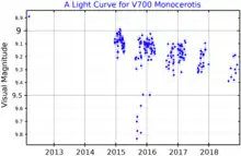 A visual band light curve for V700 Monocerotis, plotted from ASAS-SN data[10]