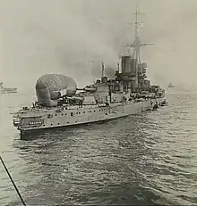 HMS Benbow was the third of four Iron Duke-class battleships of the Royal Navy, the third ship to be named in honour of Admiral John Benbow.[1] Ordered in the 1911 building programme, the ship was laid down at the William Beardmore and Company shipyard in May 1912, was launched in November 1913, and was completed in October 1914, shortly after the outbreak of the First World War. The four Iron Dukes were very similar to the preceding King George V class, with an improved secondary battery. She was armed with a main battery of ten 13.5-inch (343 mm) guns and twelve 6 in (152 mm) secondary guns. The ship was capable of a top speed of 21.25 knots (39.36 km/h; 24.45 mph), and had a 12-inch (305 mm) thick armoured belt.