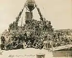 Most of the German 105-millimetre (4.1 in) shells failed to damage the British ship, but one did burst inside a gun position, killing or wounding most of its crew, and another burst inside the wireless compartment and knocked out her radio transmitter. The British shells battered Nürnburg severely; she was dead in the water by 18:25 with only two guns able to fire. Ten minutes later not a gun could shoot and the cruiser was aflame. She did not strike her colours until 18:57 and then lowered a boat filled with some of her wounded men. It promptly sank and Kent had to repair the splinter holes in her own boats before they could be launched. Nürnburg capsized half an hour later and Kent continued to search until 21:00, but only rescued a dozen men, five of whom later died.[16] She had been hit 38 times, but none of them penetrated her armour. One shell passed through the radio office without detonating and disabled Kent's transmitter. Another shell burst outside a midships casemate and ignited several bags of cordite. The flash fire travelled down the ammunition hoist, but quick action by a Royal Marine in the ammunition party in removing the cordite charge ready to be hoisted, closing the door to the magazine and promptly using a fire hose prevented a catastrophe. The ship suffered six crewmen were killed and eight seriously wounded during the battle; ten of these were in the casemate where the cordite ignited.[17] Kent was critically short of coal and had to steam slowly enough that she did not arrive at Port Stanley until the following afternoon.[18]