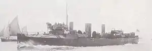 Between 1910 and 1912, Zephyr served as part of the Sixth Destroyer Flotilla based at The Nore.[26] On 14 June 1911 Zephyr collided with the destroyer Zebra during night exercises off the mouth of the River Thames. One of Zebra's six-pounder guns and two of her boats were knocked into the sea, but no crew were injured.[28] After repair, Zephyr was attached to the Harwich submarine flotilla, relieving the destroyer Porcupine.[29] On 30 August 1912 the Admiralty directed all destroyers were to be grouped into classes designated by letters based on contract speed and appearance. After 30 September 1913, as a 27-knotter, Zephyr was assigned to the A class.[30][31][32]